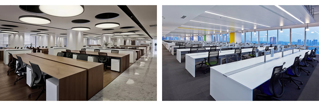 办公空间设计装修采光系统的基本设计共有五种:直接光、半直接光、同接光、半间接光、直接间接光。其中,采用间接光或直接光接光较为优良。办公室采光的来源包括自然光、日光灯及白炽灯。东莞写字楼装修采用自然光比较好,因为自然光有益于心身健康。但因早晚采光不一,或者办公室光照条件的限制,需有人造光以弥补其采光不足。当自然光不足时,目光灯能提供大量的照明,较其他光适宜办公室。